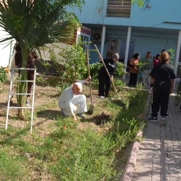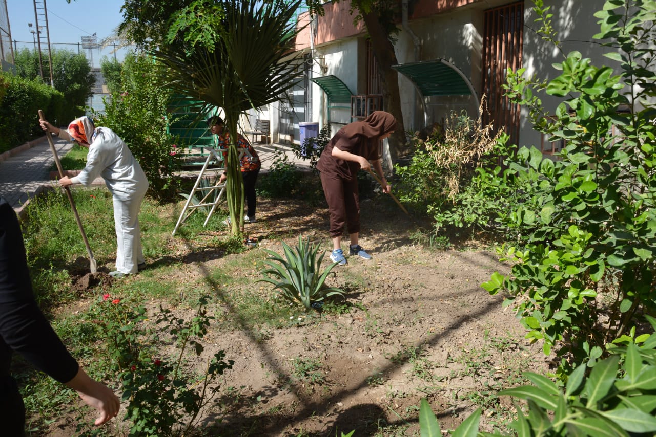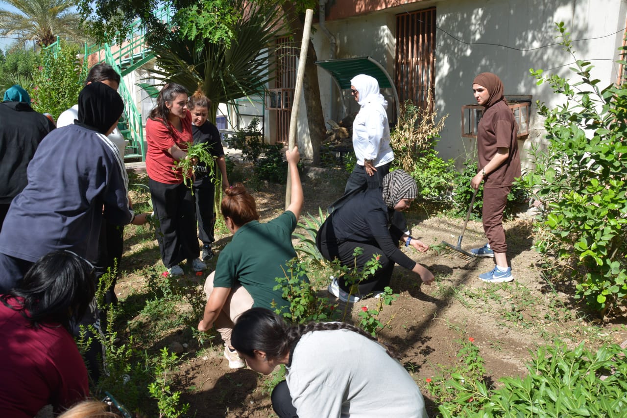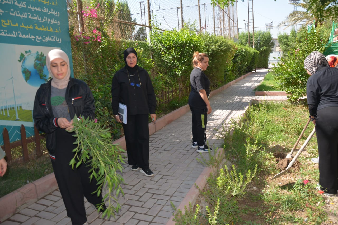 As part of efforts to enhance the role of women in managing climate change risks and protecting the environment, the Women’s Affairs Unit, in cooperation with the Voluntary Work Unit at the College of Physical Education and Sports Sciences for Women, University of Baghdad, organized a large-scale tree-planting campaign in the college gardens on Tuesday, October 7, 2025. The campaign was held with the participation of the Dean of the College, Prof. Dr. Fatima Abd Malih, along with several students, to promote environmental awareness and spread a culture of sustainability.