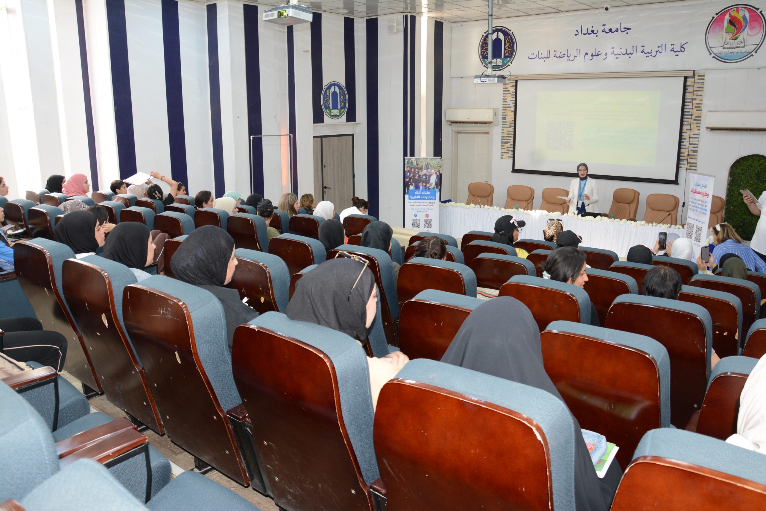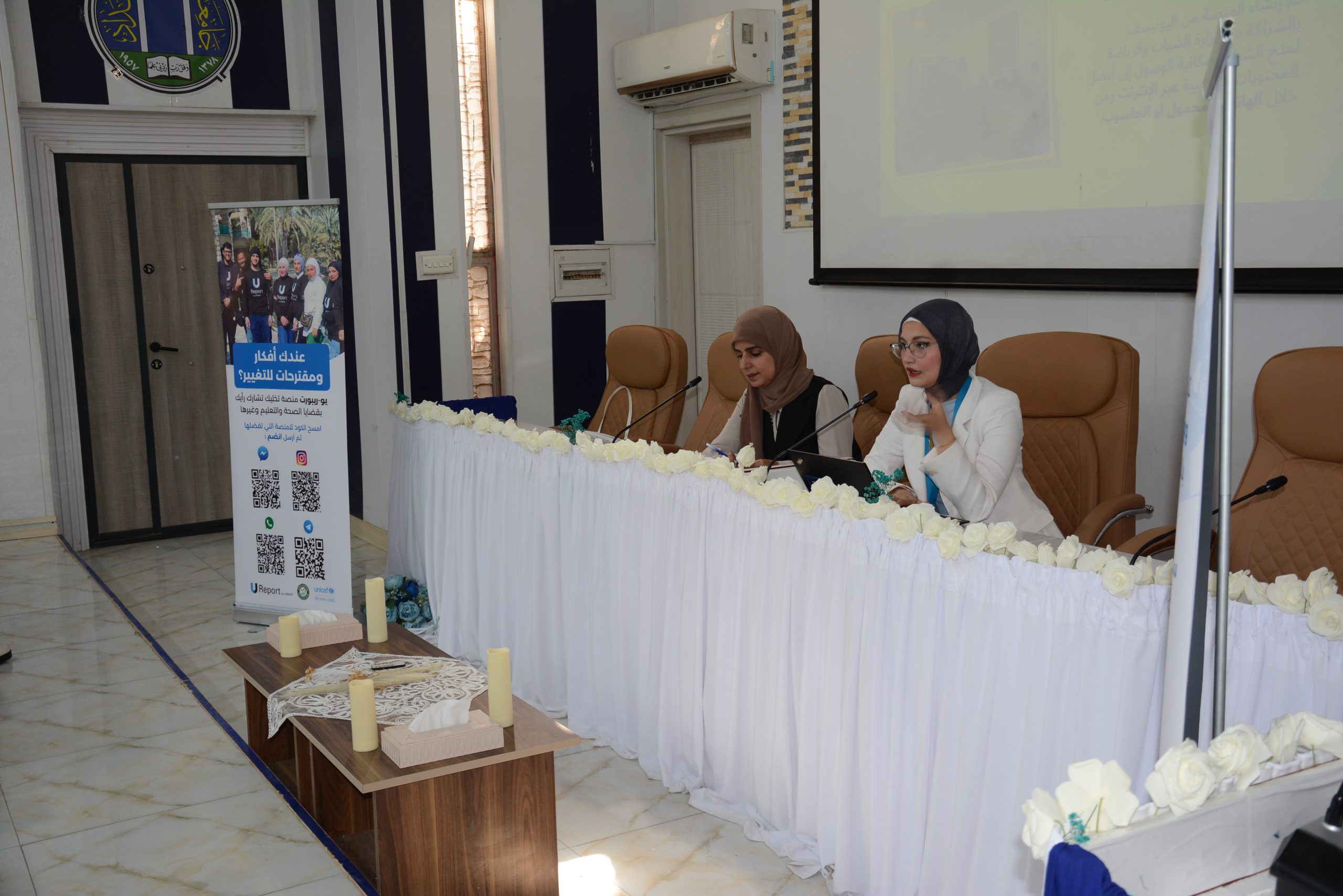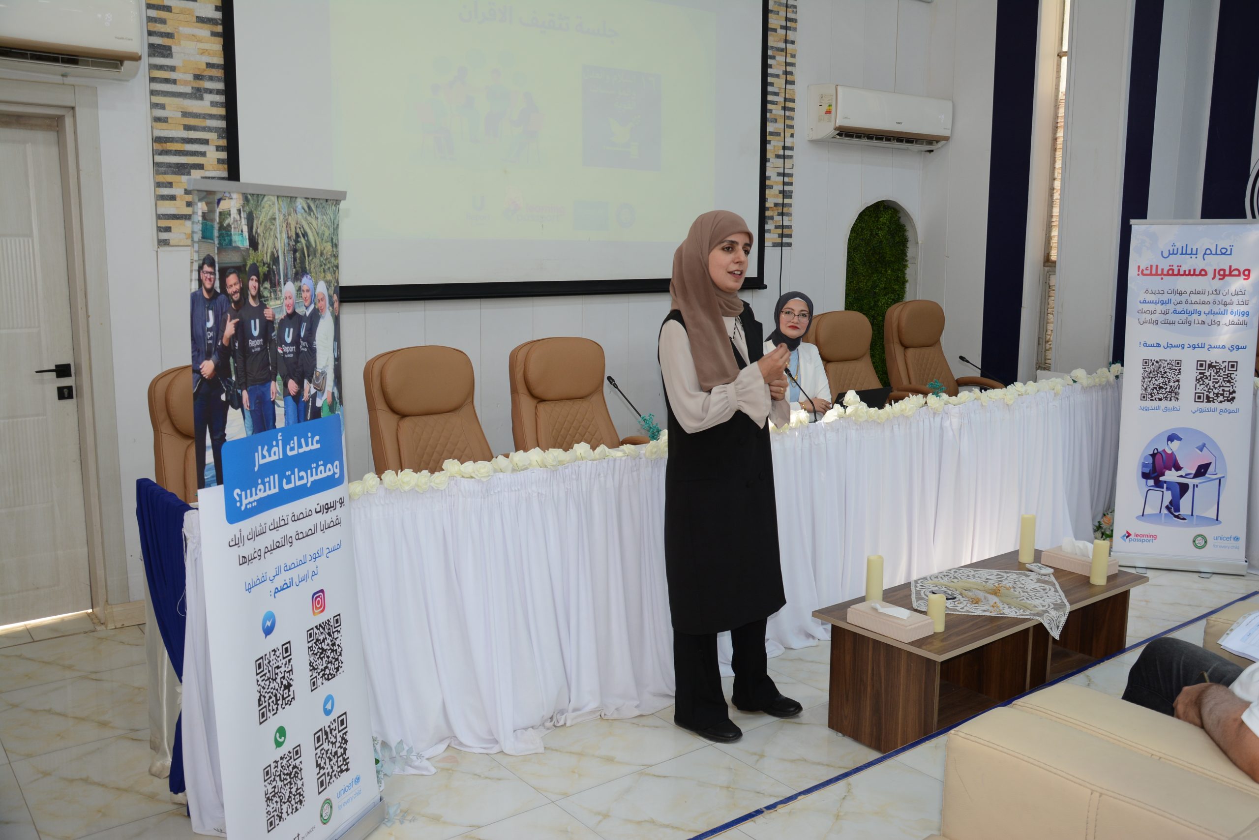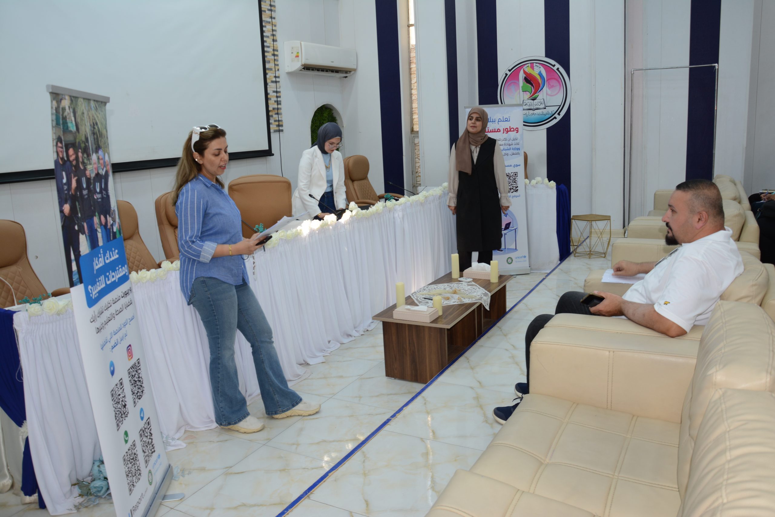 The Rehabilitation and Employment Unit at the College of Physical Education and Sports Sciences for Women, University of Baghdad, hosted — under the patronage of the Dean, Prof. Dr. Fatima Abd Malih, and the supervision of Asst. Lect. Safia Ihsan Kamel — a delegation from UNICEF and the Ministry of Youth and Sports to hold a scientific workshop entitled (Empowering University Students in Designing and Implementing Small Youth Initiatives Within the University).