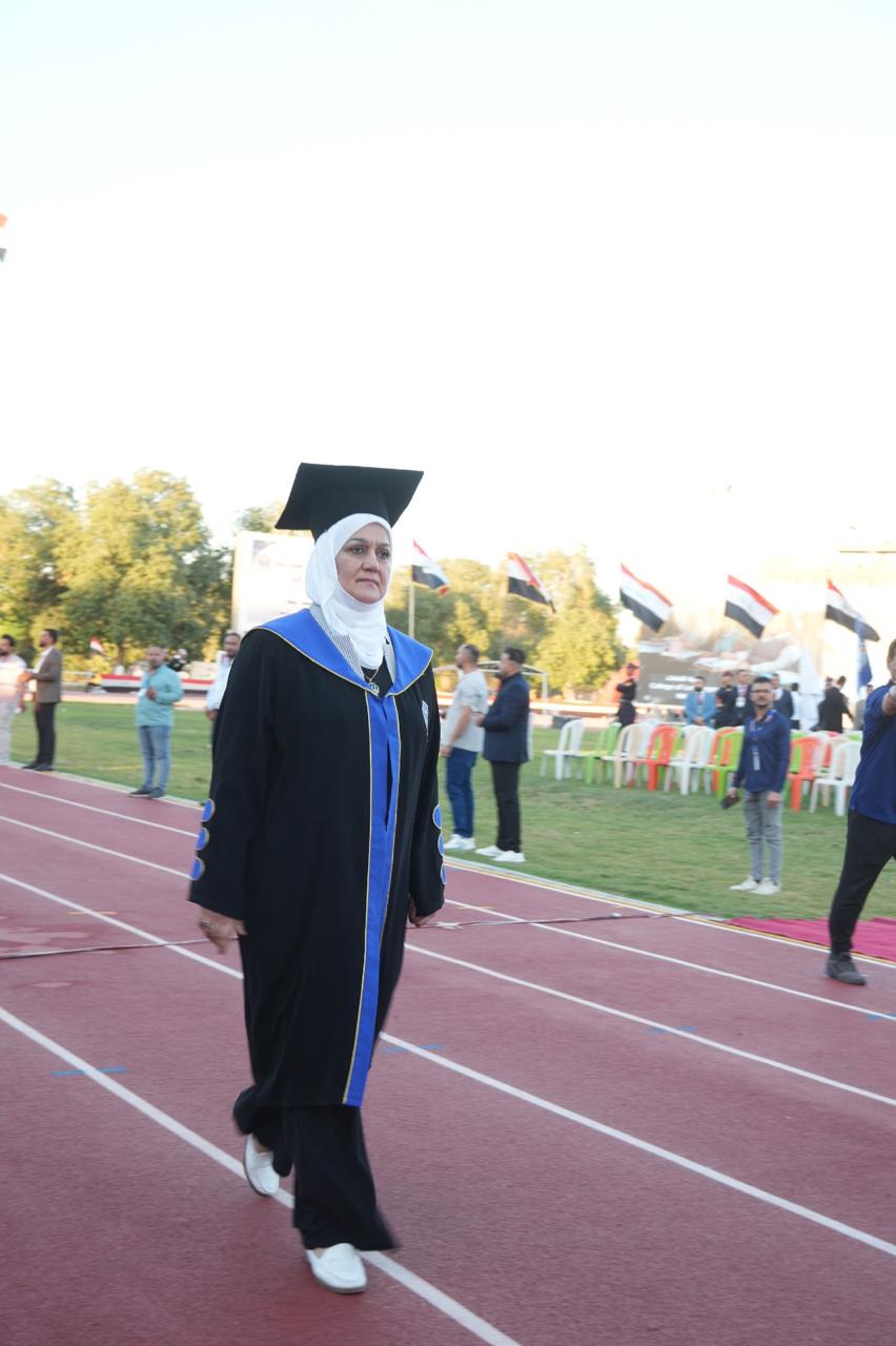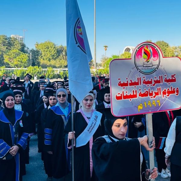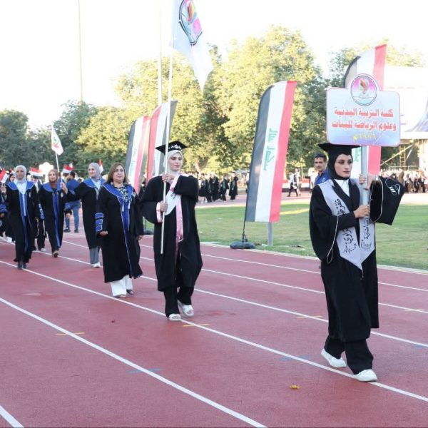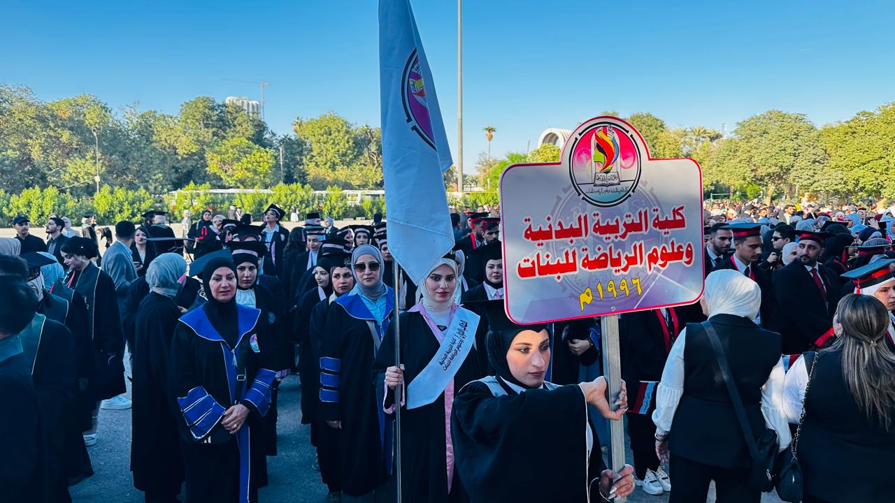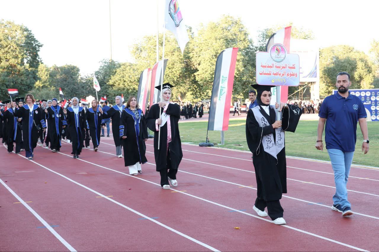 The College of Physical Education and Sports Sciences for Women – University of Baghdad participated in the central graduation ceremony held under the theme (Cohort of Creativity and Excellence). The event was organized by the University of Baghdad at the College of Physical Education and Sports Sciences and attended by the Minister of Higher Education and Scientific Research, Prof. Dr. Naeem Al-Aboudi.